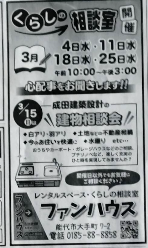 さて、3月の「くらしの相談室」の日程についてお知らせいたします。